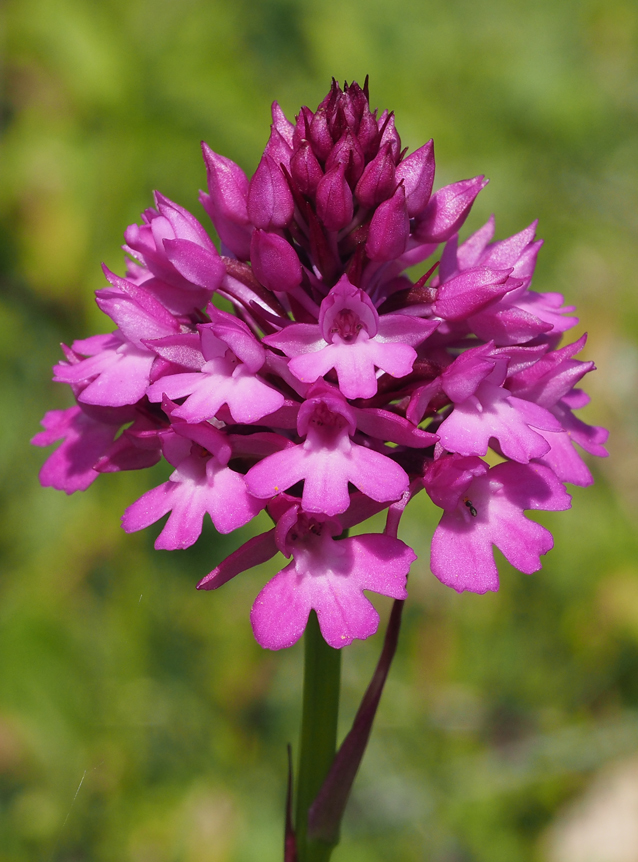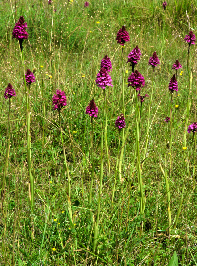 Knollengeophyt, Stängel 34 - 53 cm hoch, 7 - 12 Laubblätter, davon 2 - 4 rosettig, nicht gefleckt, 10 - 17 cm lang und 0,9 - 2,1 cm breit, meist rinnig und aufwärtsgerichtet. Stängelblätter scheidenförmig, das oberste 1,2 - 2,2 cm lang; es erreicht meist den Beginn des Blütenstandes. Blütenstand am Grunde breit ausladend, kegel-eiförmig, beim Abblühen verlängert eiförmig, 3,5 - 8 cm lang. Er trägt 20 - 60 relativ dicht stehende Blüten, die meist dunkel karminrot gefärbt sind; helle Exemplare sind seltener; Brakteen lanzettlich, rötlich überlaufen, fast so lang wie der Fruchtknoten, 9 - 12 mm lang und 1,7 - 3,3 mm breit. Fruchtknoten gedreht, 10 - 14 mm lang und 1,5 - 2,7 mm breit. Das mittlere Sepal und die Petalen bilden einen Helm, der das Gynostemium halbkreisförmig bedeckt. Mittleres Sepal kleiner als die seitlichen, symmetrisch, 5 - 6 mm lang und 2 - 3 mm breit. Petalen schief eiförmig, 5 - 6 mm lang und 2,5 - 3,2 mm breit. Lippe extrem gespornt, dreilappig mit 2 aufrechten Längsleisten an der Basis, 6 - 8 mm lang und 8 - 11 mm breit. Seitenlappen stumpf abgerundet, innen 2 - 4 mm, außen 5,5 - 7,5 mm lang, 2 - 4 mm breit. Mittellappen meist länger als Seitenlappen, 2,5 -4 mm lang und 2 - 3,2 mm breit. Sporn lang, stecknadelförmig, am Ende kurz zugespitzt, etwas länger als der Fruchtknoten, 11,5 - 16 mm lang und 0,5 - 0,8 mm breit, leicht abwärtsgerichtet. Beide Pollinien besitzen eine gemeinsame sattelförmige Klebscheibe. Früchte von unten nach oben an Größe abnehmend; kurz gestielt, 9 - 15 mm lang und 4 - 5,5 mm breit, am freien Ende mit Blütenresten. Fruchtreife ab Mitte Juli.