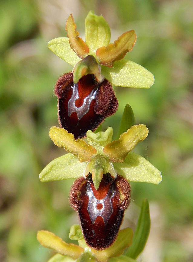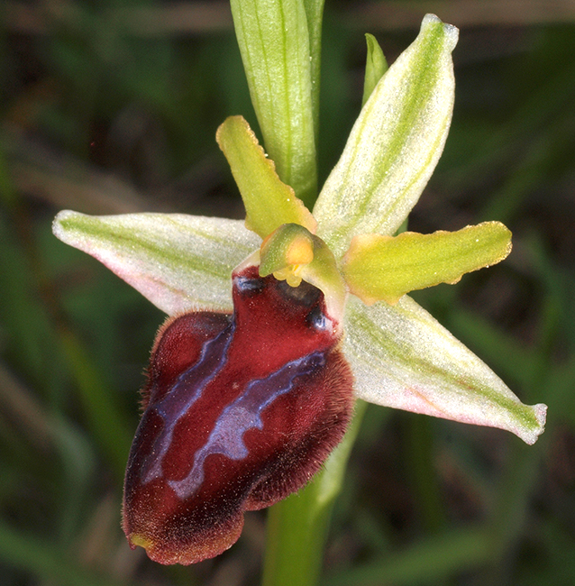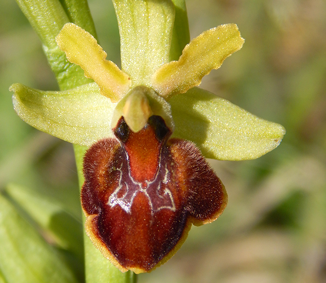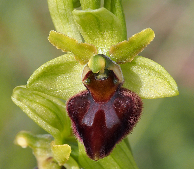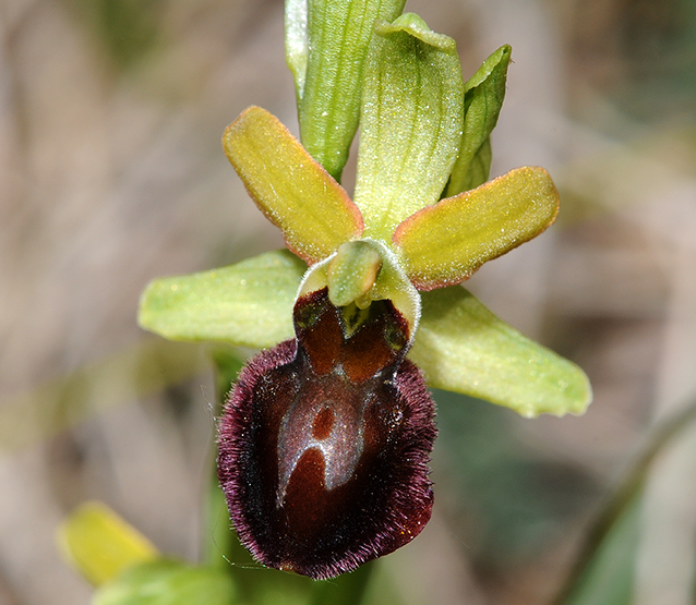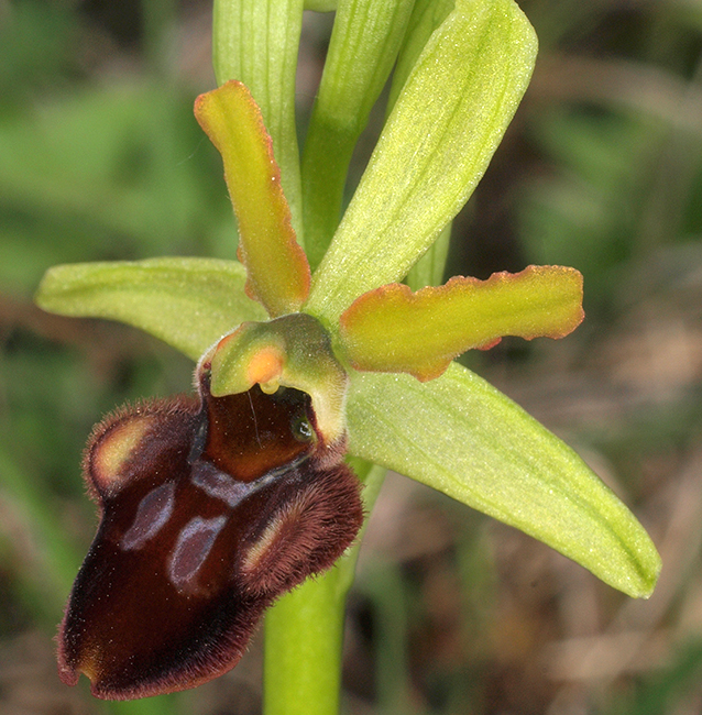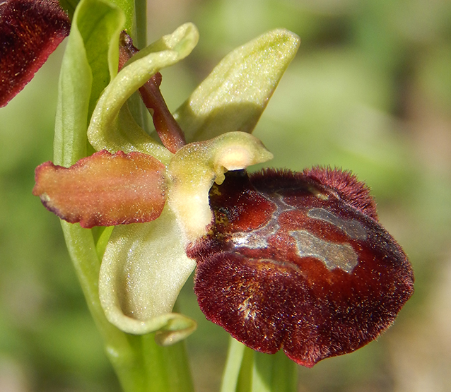 Im zeitigen Frühjahr treiben aus kräftigen Exemplaren Blütensprosse, Stängel 20 - 50 cm hoch, mit 3 - 6 rosettig gehäuften, breit lanzettlichen Grundblättern blaugrün silbrig schimmernd, 4 - 10cm lang und 1,7 - 2,7 mm breit. Nach oben folgen 3 - 5 scheidige Stängelblättern, das oberste 4 - 9 cm lang, es erreicht den Beginn der Ähre nicht. Blütenähre langgestreckt, 4 - 18 cm lang und locker mit 2 - 8 mittelgroßen Blüten besetzt. Tragblätter krautig, grün, die unteren länger als die Blüten, die oberen etwa gleich lang. Fruchtknoten gedreht, walzlich. Sepalen hell olivgrün, breit eiförmig, die paarigen seitlich ausgebreitet, das unpaare aufwärts gerichtet bis leicht nach vorn gekrümmt, 10 - 13 mm lang und 3 - 6 mm breit. Petalen ½ - 2/3 so lang wie die Sepalen, gelbgrün bis bräunlich, am Rande gewellt, stumpf, kahl, 7-9 mm lang und 2,8-4,5 mm breit. Lippe ganzrandig oder undeutlich dreilappig, schwach konvex, an den Schultern schwach bis stark gehöckert und kräftig behaart, 10 - 13 mm lang und 8 - 11 mm breit, dunkel rotbraun, zuweilen mit gelbem Rand, kurz papillös, an der Spitze ausgerandet. Anhängsel fehlend bis klein. Malzeichnung H-förmig, trüb violett mit hellerem Rand, zwischen den Höcker und bis zur Lippenmitte sich erstreckend. Basalfeld heller, klein, Basalschwielen halbkugelig, grünbraun, glänzend. Staminodialpunkte fehlend. Die niedrige Narbenhöhle wird von einem purpurnen Transversalband durchzogen. Pollinarien langgestielt mit getrennten Klebscheiben und Beutelchen. Früchte aufrecht, zylindrisch, 15 - 17 mm lang und 4 - 6 mm breit.