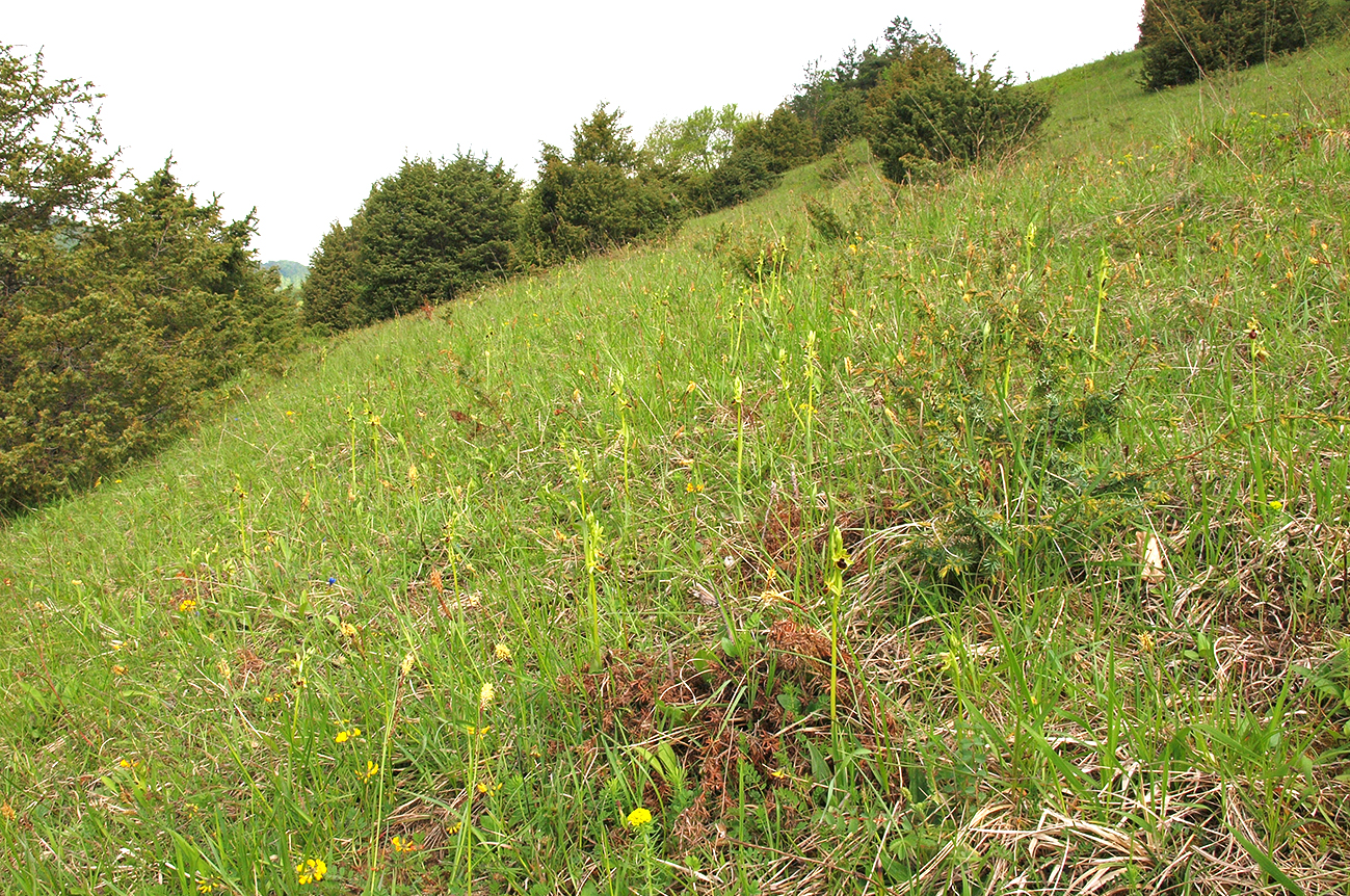 Mit allen im Gebiet vorkommenden Ophrys-Arten außer O. elatior.