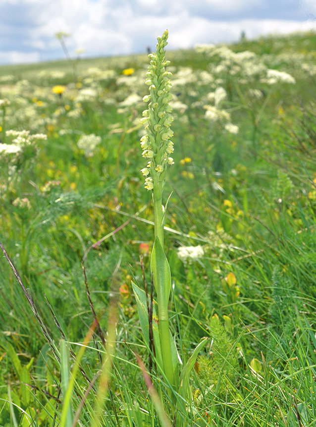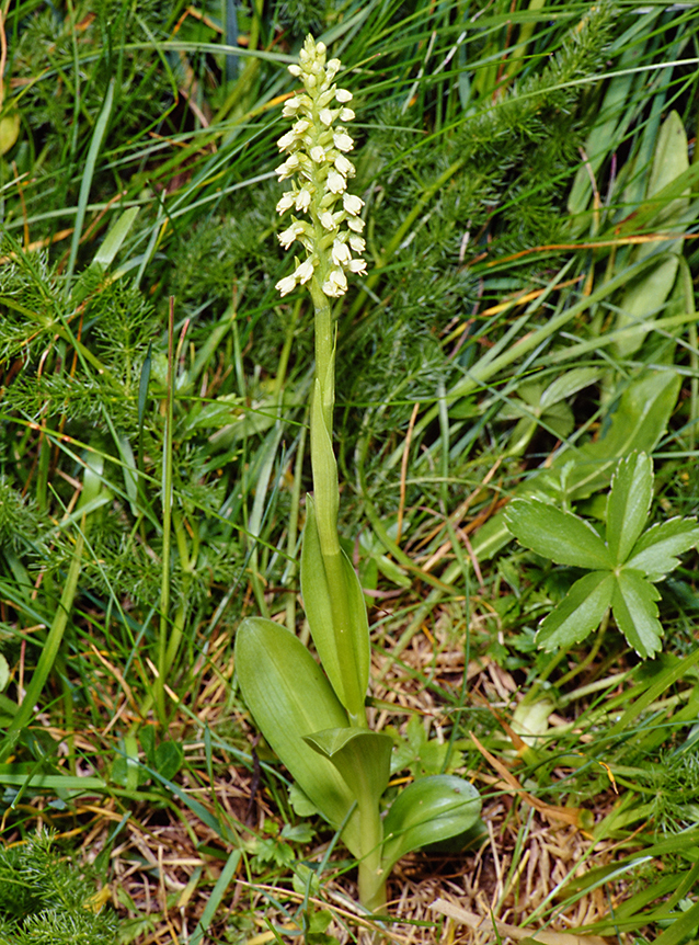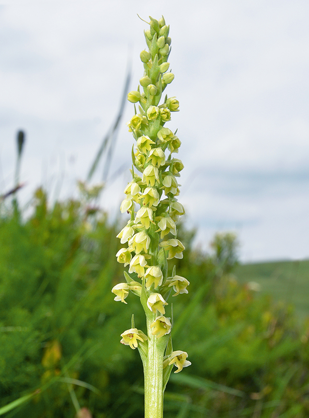 Knollengeophyt mit zwei tief gespaltenen Knollen und langen Wurzeln. Aus einer Tochterknolle bildet sich bereits im Herbst ein Spross, der an der Erdoberfläche überwintert und im Frühjahr Laubblätter treibt. Der Blütenstängel steht steif aufrecht und weist 3 - 7 dunkelgrüne glänzende Laubblätter auf, die unteren schräg, die oberen steil aufrecht am Stängel stehend. Die grundständigen Blätter sind eiförmig länglich, 5 - 9 cm lang und 1 - 2 cm breit; die mittleren Blätter sind am größten, die oberen kleiner und breit lanzettlich. Das oberste Stängelblatt ist 1 - 4 cm lang und erreicht den Blütenstand nicht. Der Blütenstand ist schmal, lang zylindrisch und dicht mit 20 - 50 kleinen, dicht am Stängel sitzenden Blüten besetzt. Sie sind weißlich-gelb bis gelb gefärbt, leicht glockig hängend angeordnet und duften schwach. Die Tragblätter sind 6 - 8 mm lang und 2 - 3 mm breit, etwa so lang wie der Fruchtkonten. Der Fruchtknoten ist gedreht, 4 - 5 mm lang und 2 - 2,5 mm dick. Die Perigonblätter neigen sich helmförmig zusammen. Die Sepalen sind länglich eiförmig, stumpf und einwärts gewölbt, 3 - 4 mm lang und 1 - 2 mm breit. Die Petalen sind kleiner, 2,5 - 3 mm lang und 1,3 - 1,6 mm breit. Die Lippe ist dreilappig mit sehr kurzen Seitenlappen von 1,2 - 1,4 mm Länge und 0,6 - 0,9 mm Breite. Der Mittellappen ist meistens etwas vorgezogen mit einer Länge von 1 - 2 mm und Breite von 0,8 - 1 mm. Der Sporn ist zylindrisch, stumpf, 2,1 - 2,7 mm lang und 0,8 - 1 mm dick. Der Sporn enthält Nektar; der Sporneingang ist sehr eng. Die Pollinarien sind gelblichgrün, keulenförmig, kurzgestielt mit einer nackten Klebscheibe.